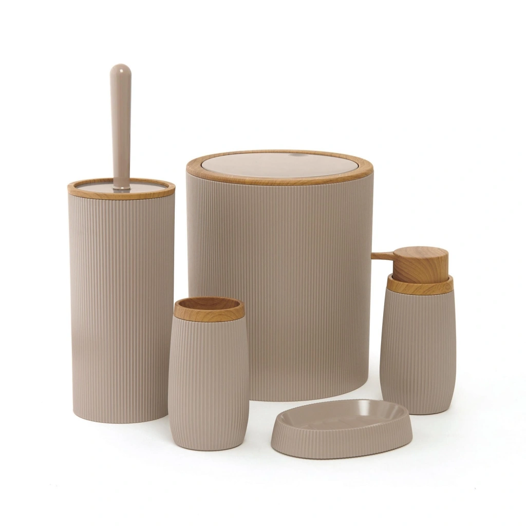 Okyanus Home Ahşap Desenli Çizgili 5'li Banyo Seti KAHVERENGİ Rengi